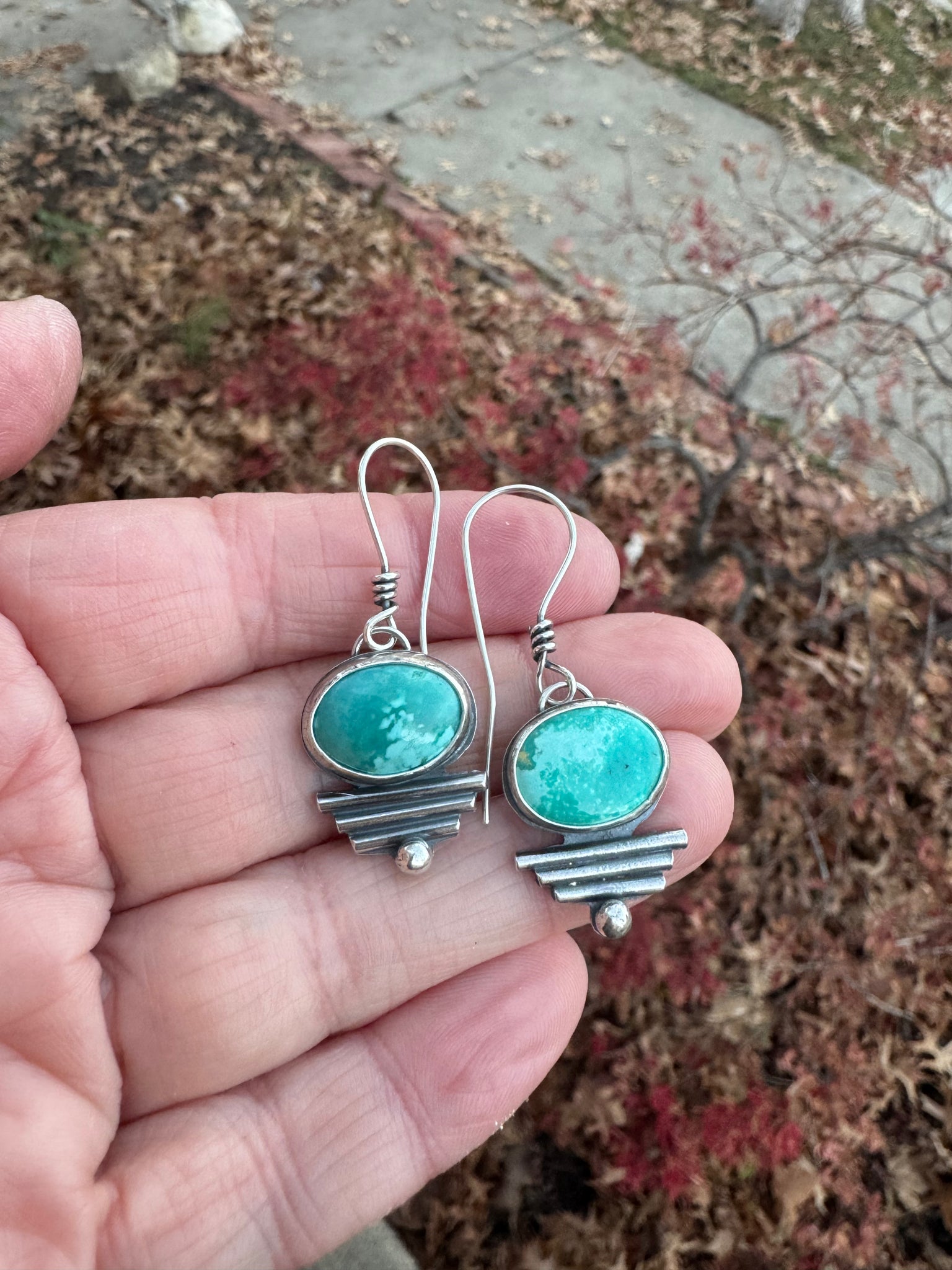 Also, custom Hubei Turquoise Art Deco Earrings. Stones were set in fine and sterling silver, oxides, tumbled and polished and hang on handmade silver earwires. Earrings are $140.